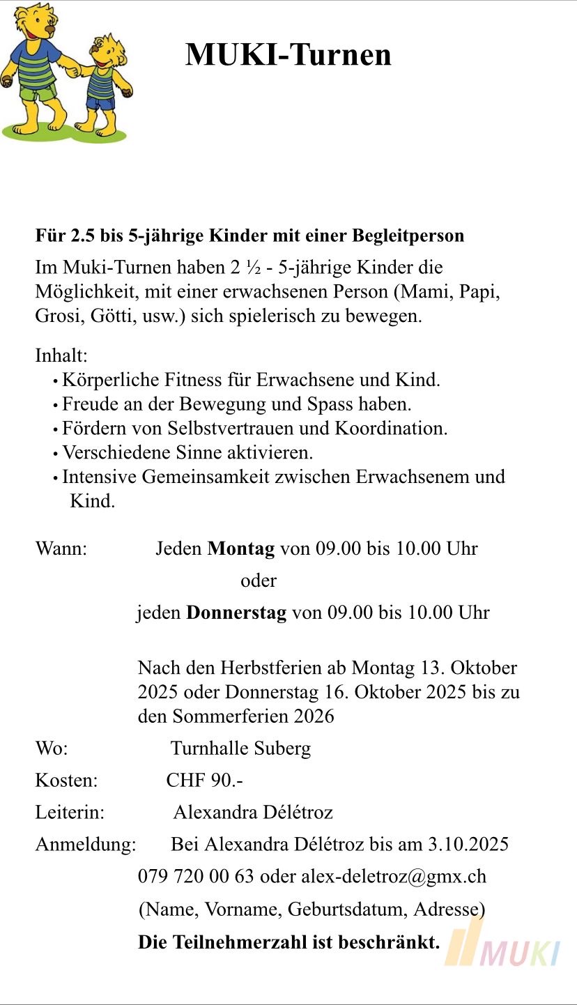 Das Muki findet nach den Schulherbstferien bis zu den Sommerferien in Suberg statt.